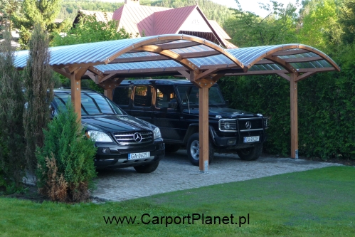 Podwójny drewniany carport do. Możesz postawić samochód pod dachem chroniąc go przed szronem, deszczem i słońcem.
